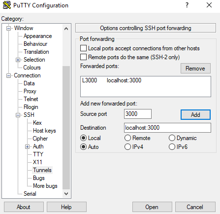 Alternatively, If using Putty for SSHing, you can configure the tunnel as follows. Make sure to click "Add" and save your new profile settings.