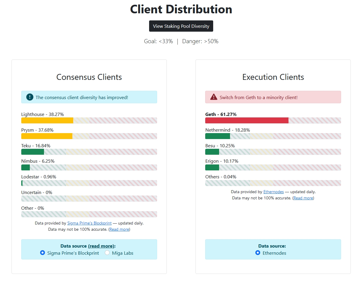 Consensus Client Diversity: To strengthen Ethereum's resilience against potential attacks or consensus bugs, it's best practice to run a minority client in order to increase client diversity. Find the latest distribution of consensus clients here: https://clientdiversity.org