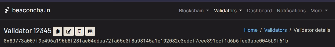 Your ETH validator index number(s) -- Enter your validator's public key on https://beaconcha.in/ or https://beaconscan.com/ Example of Validator index # 12345 is shown below.